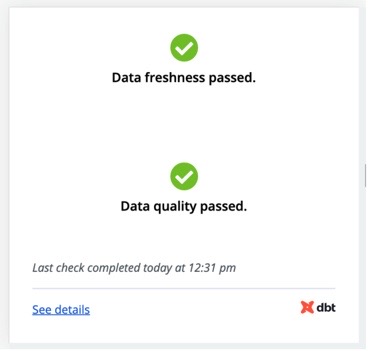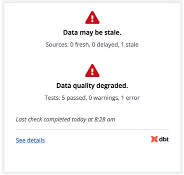 The data freshness check fails if any sources feeding into the exposure are stale. The data quality check fails if any dbt tests fail. A failure state could look like this: