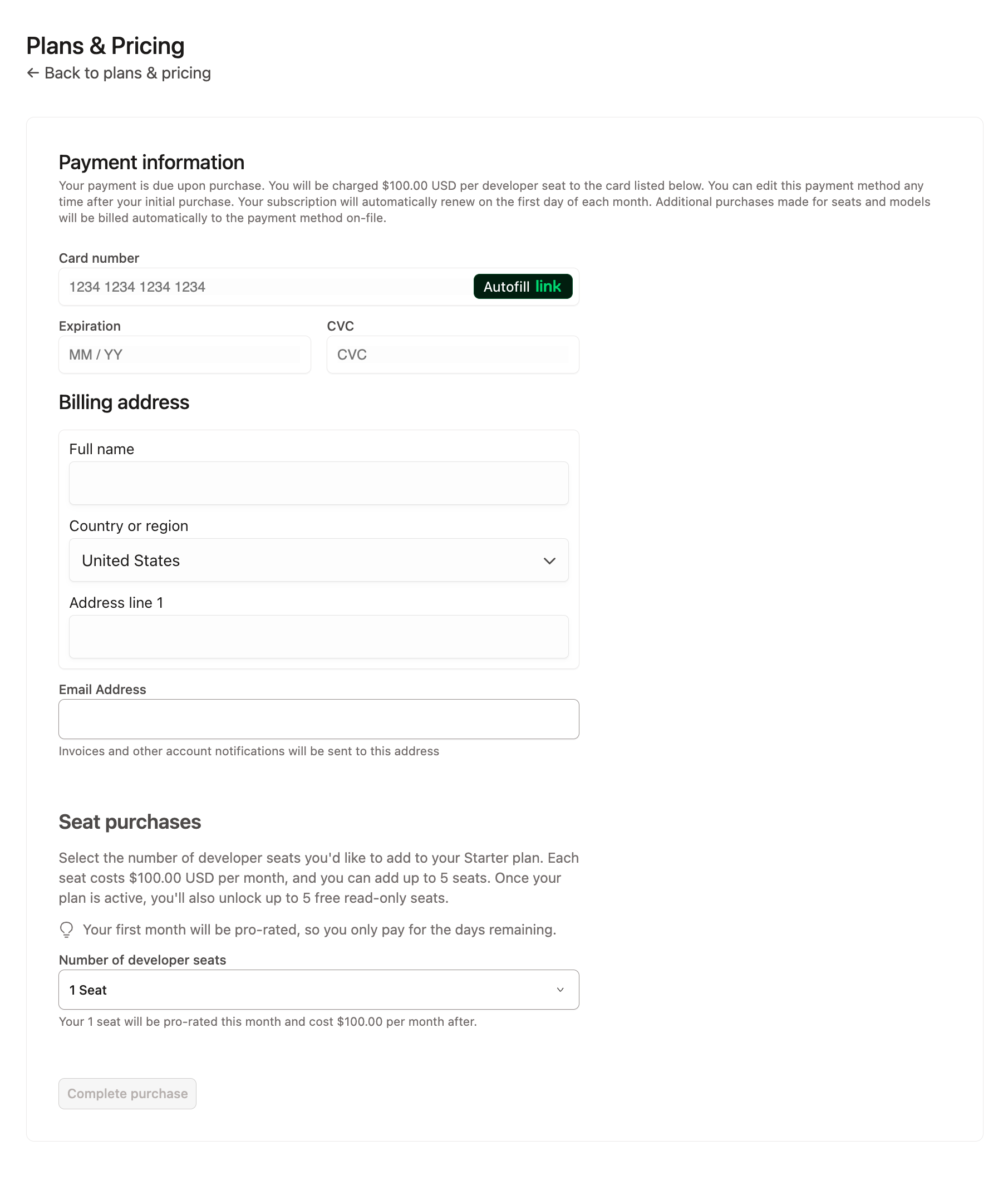 Starter plans are billed monthly on the credit card used to sign up, based on developer seat count and usage. You’ll also be sent a monthly receipt to the billing email of your choice. You can change any billing information in your Account Settings > Billing page.